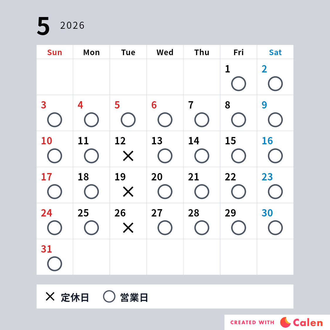 5月の営業日は以下のカレンダーをご確認ください。